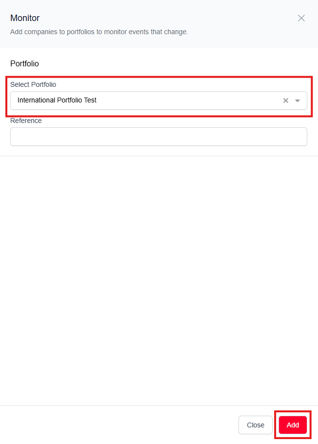 This will bring up a sidebar on the right side of your screen where you can select the portfolio you would like the company to be monitored in, and write a reference if necessary. When you are happy with your choice, click 'Add'.