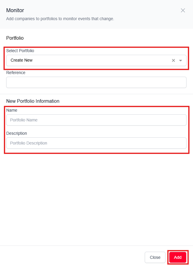 If you would like to add this company to a new portfolio instead of an existing one, you can click 'Create New' from the dropdown. Name your portfolio, add a description, and click 'Add'.