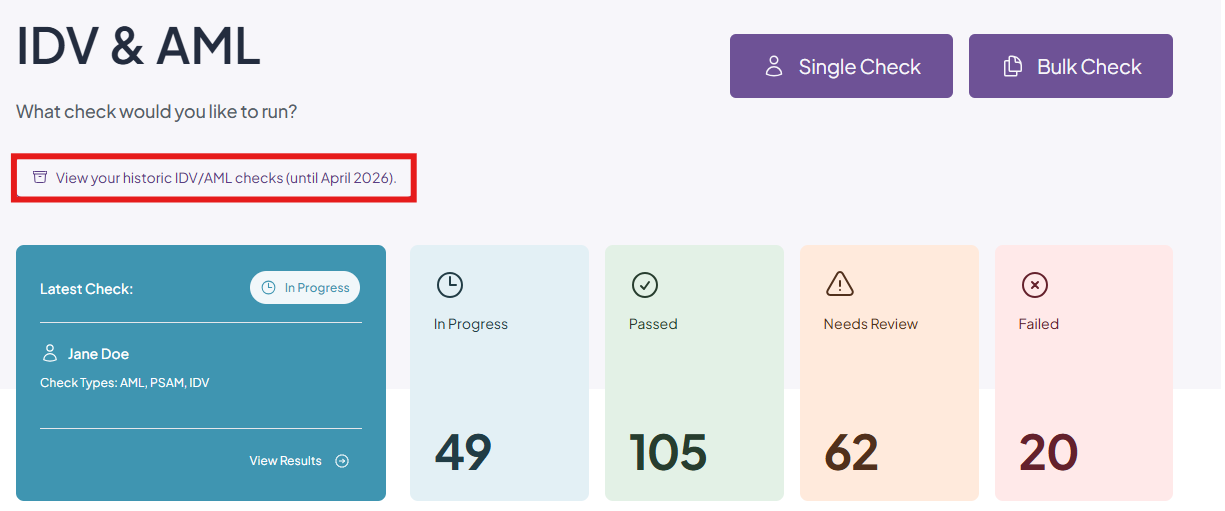You can also view any checks that were sent out/completed using our legacy system by clicking the 'View your historic checks' button. Please note that this will only available until April 2026.