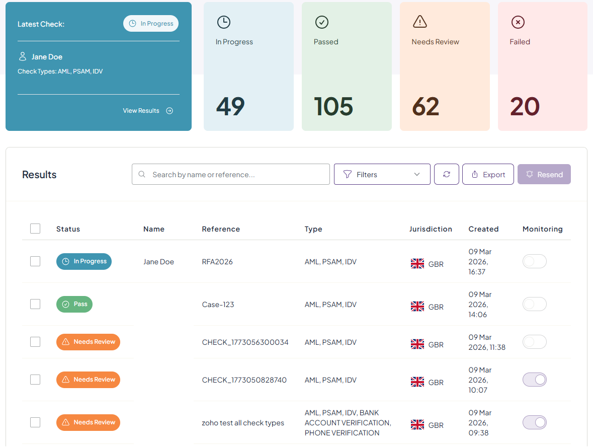 From the IDV & AML page, you can view your latest check, sent checks and their status. To filter to view a specific check, you can use the filters button, search bar, or click the required category box - e.g., 'Passed' to view all 'Passed' checks.