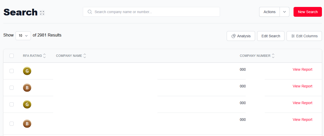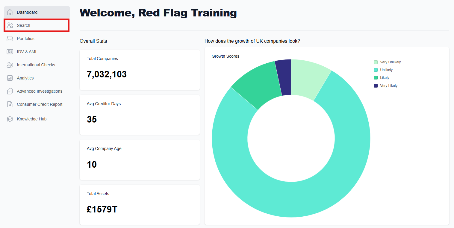 Having accessed the main dashboard, click on the 'Search' button on the left hand side. This will take you to the search page, where you will be able to look for a company/companies.