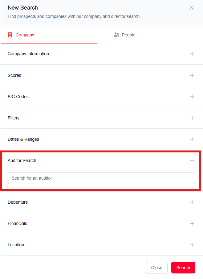 Auditor search is found within the advanced company search parameters.